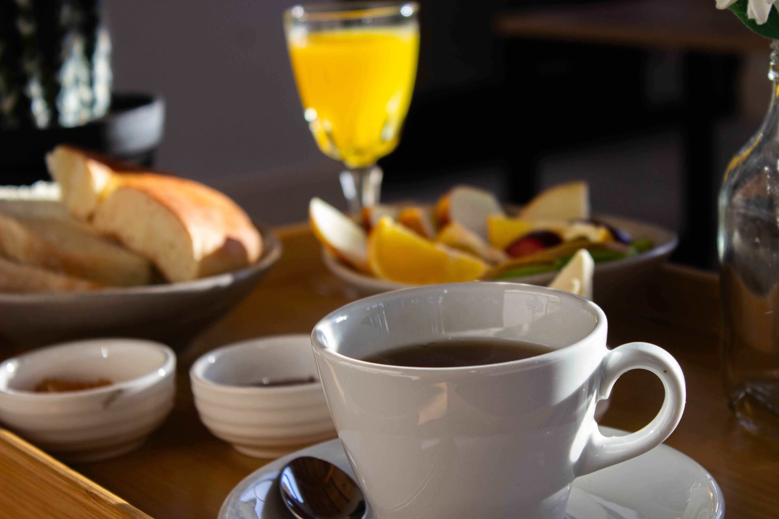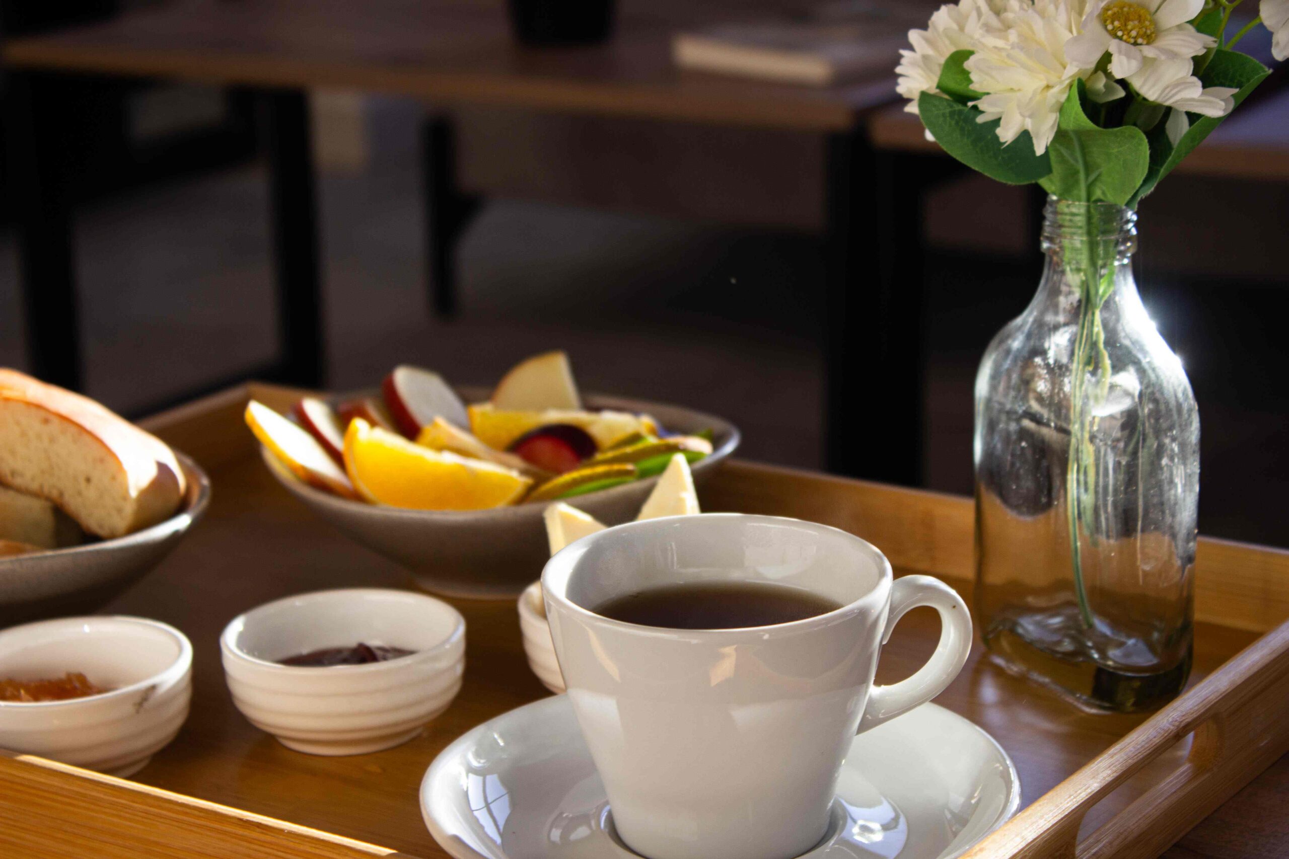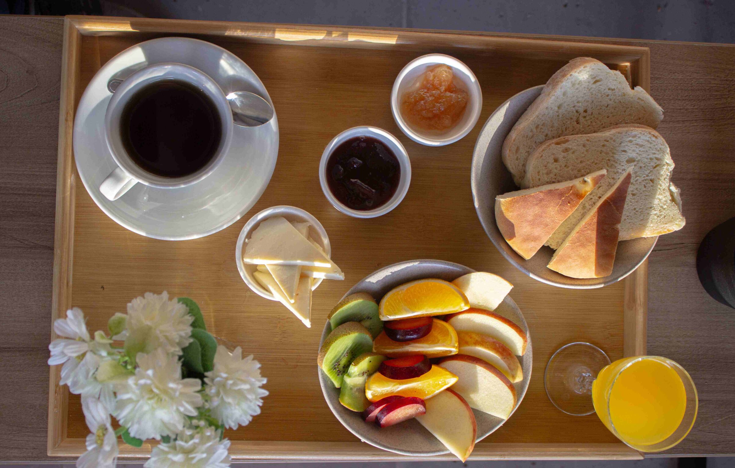 Para el desayuno, los huéspedes pueden disfrutar de mermeladas y quesos regionales, de la panadería artesanal, junto a frutas, jugos e infusiones, los que se sirven en cada cabaña.