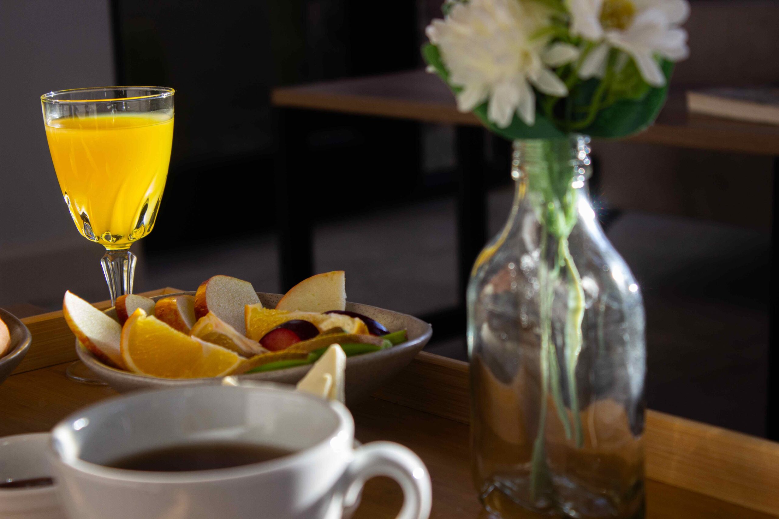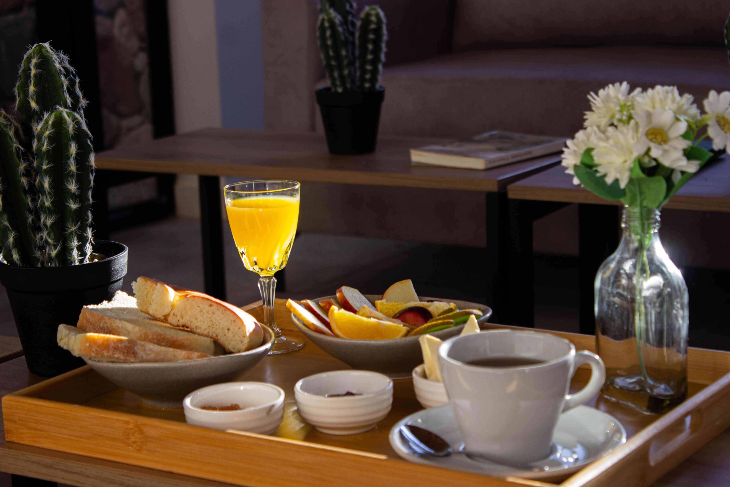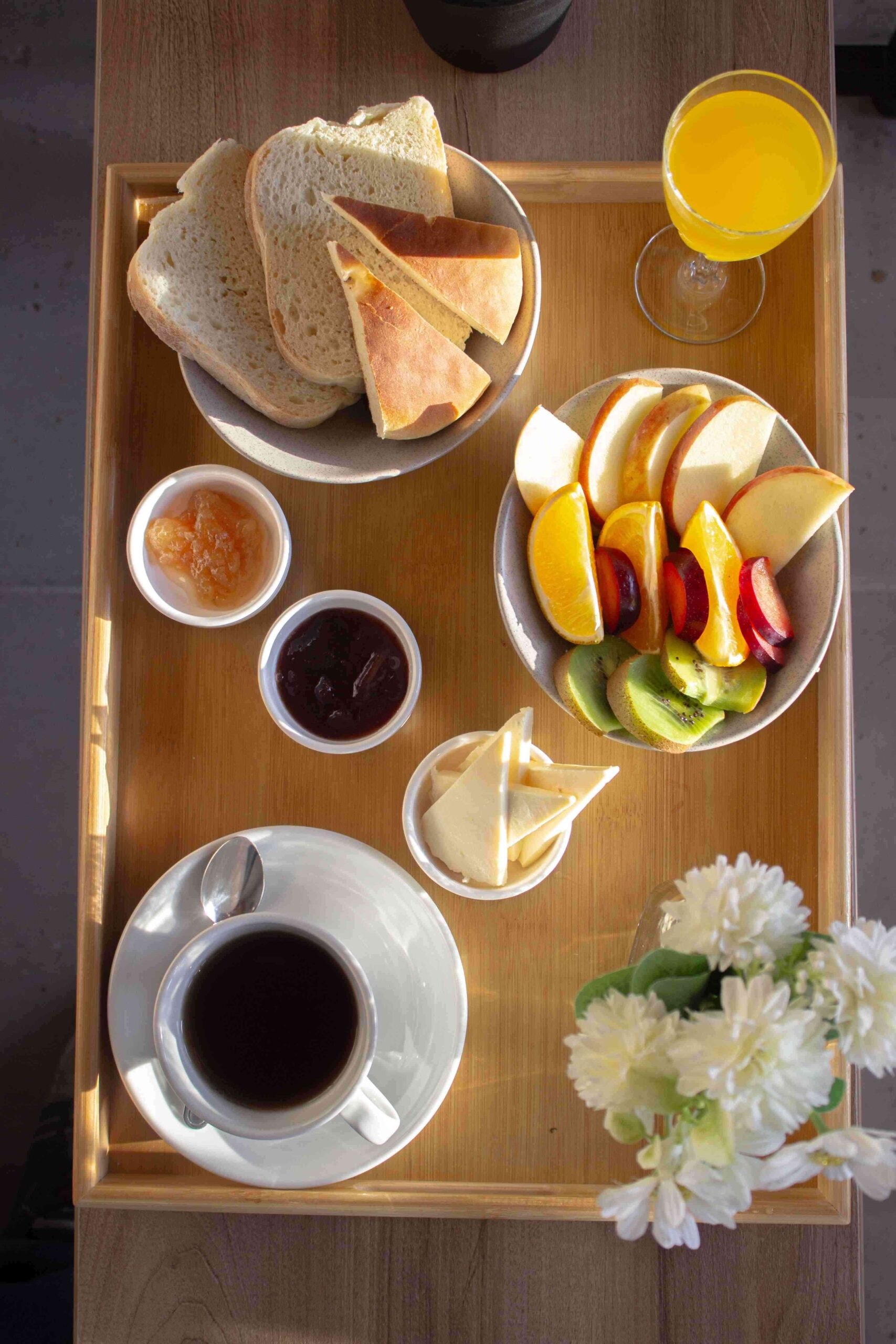 Para el desayuno, los huéspedes pueden disfrutar de mermeladas y quesos regionales, de la panadería artesanal, junto a frutas, jugos e infusiones, los que se sirven en cada cabaña.